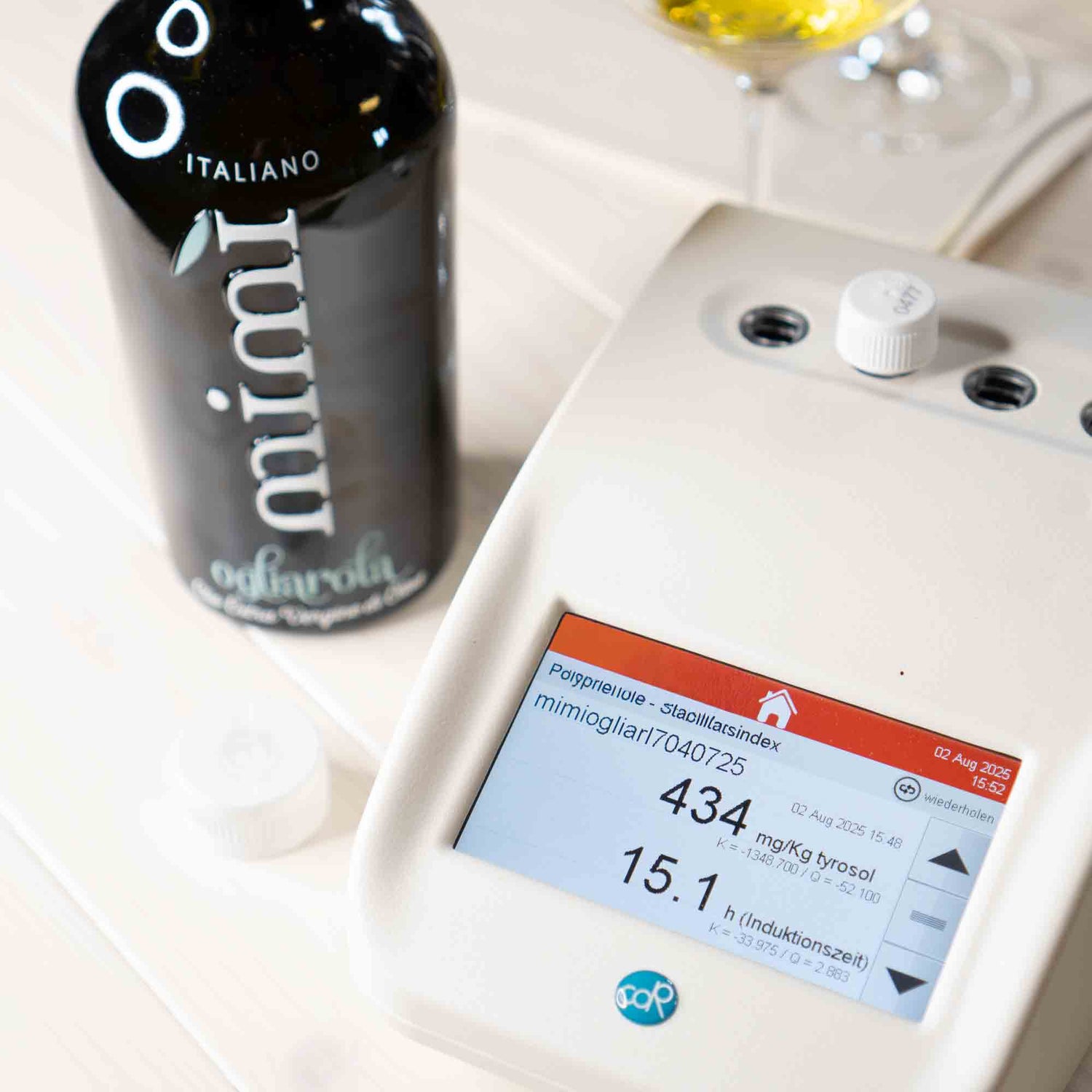 Um die Qualität zu sichern, lassen wir uns die Laboranalysen der Lieferanten zukommen und machen zusätzlich Stichproben einzelner Olivenöle mit unserem eigenen Analysegerät, mit dem wir Säuregrad, Peroxide und Polyphenolwerte testen können.