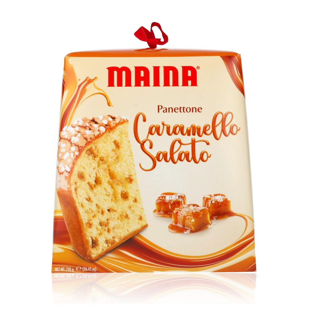 Ein natürlich gereifter, luftiger Panettone, im Teig mit vielen Stücken köstlichem Salzkaramell und oben mit knusprigem Haselnussguss und Zuckerkörnern veredelt.