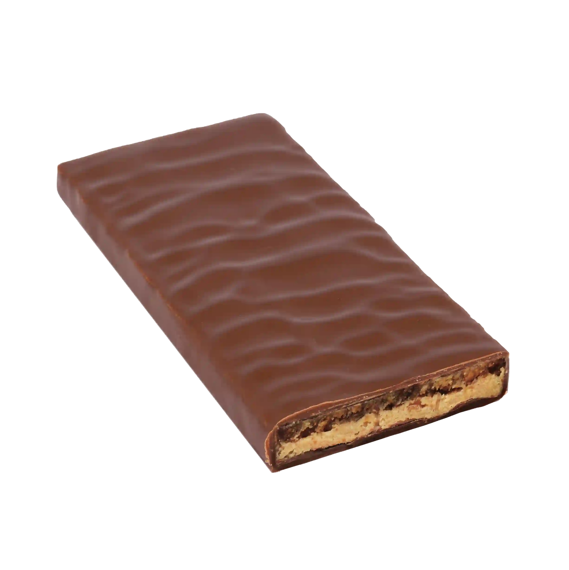 Eine delikate Fruchtschicht aus in Honig-Karamell kandierten Apfelstückchen. Dazu eine Zimtschicht aus Haselnussnougat und weißer Schokolade. Eingehüllt in Milchschokolade mit 50 % Kakaopower und feinem Schmelz. Eine fruchtig-zimtige Schokolade, die mit süßen Genussmomenten die Wintertage verzaubert.